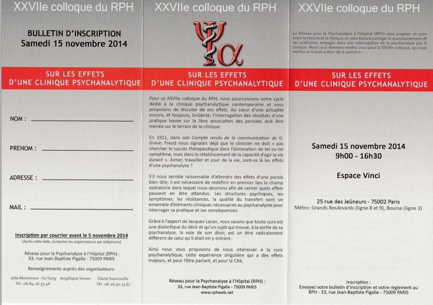 Ce soir, naviguant sur les réseaux sociaux, je tombe sur un message posté dans l’un des groupes des étudiants de l’université Paris Descartes. Celui-ci fais de la communication pour un colloque qui aura lieu le 15 novembre 2014 organisé par une association qui m’était jusque là inconnue. Un certain Réseau pour la psychanalyse à l’hôpital (RPH). Je m’enquis donc d’un sourire teinté de tristesse à l’idée de la dangerosité du seul titre, puis lis la brochure ci-dessous.